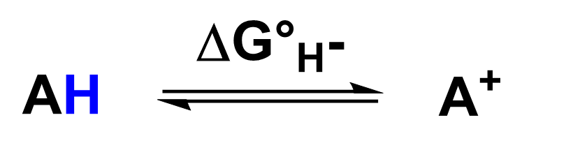 Les transferts d’hydrures (H-) sont des étapes élémentaires lors de nombreuses transformations chimiques pour des applications industrielles, dans le domaine de l’énergie mais également dans des processus biochimiques. Lors de ces réactions, sont impliqués un donneur et un accepteur d’hydrure. La compréhension de ces phénomènes nécessite de déterminer les valeurs d’hydricité des réactifs mis en jeu, c’est-à-dire la capacité qu’ils ont à donner un hydrure (et inversement à l’accepter). L’hydricité, aussi notée ∆H-, est la valeur thermodynamique qui traduit le changement d’énergie libre lié à la dissociation d’un donneur d’hydrure (AH) vers l’hydrure (H-) et son accepteur conjugué (A+). (équation 1)