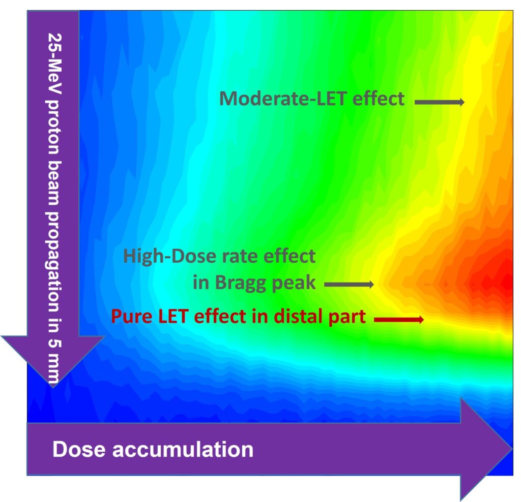 More broadly, the study highlights the experimental challenges involved in directly measuring radical species under high-ionization-density conditions. Optical probe molecules used to detect radicals can themselves be altered within ionization tracks or experience fluorescence quenching, leading to an underestimation of absolute yields. Despite these limitations, the results provide valuable new insight into the radiation chemistry of proton beams in water and help clarify the physico-chemical mechanisms occurring in the Bragg peak region ; an area of particular importance for radiobiology and for optimizing proton-therapy treatments.