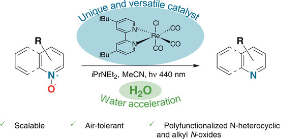 Water-Mediated Rhenium-Catalyzed Photodeoxygenation of Polyfunctional Organic N-Oxides