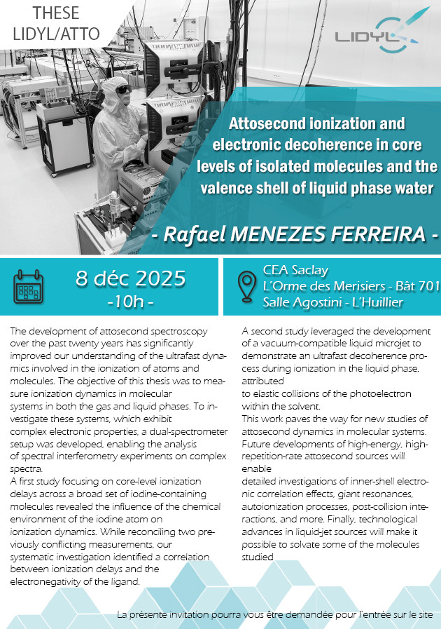 Une deuxième étude a mis à profit le développement d’un micro-jet liquide sous vide pour mettre en évidence un processus de décohérence ultrarapide lors de l’ionisation en phase liquide, attribué aux collisions élastiques du photoélectron dans le solvant.