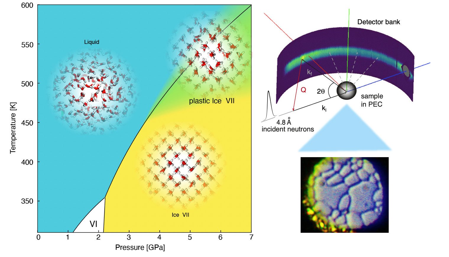 Gauche : Diagramme de phase de l’eau à haute pression et température et représentation de la région d’existence de la nouvelle phase plastique. Droite : Schéma de l’instrument IN5B à l’ILL et image de la glace plastique dans une cellule à enclume à diamant. Les contours arrondis des cristaux sont indicatifs de la phase plastique. © Rescigno, M., Toffano, A., Ranieri, U. et al