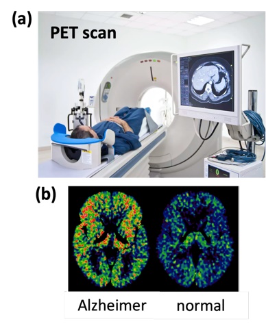 (a) tomographie par émission de positons (PET) ; (b) surexpression de TSPO dans le cerveau d’un patient atteint de la maladie d’Alzheimer