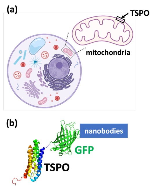 Fig. 2. Production et purification de TSPO. (a) Localisation de TSPO dans la membrane externe de la mitochondrie ; (b) stratégie de purification basée sur la reconnaissance de la protéine de fusion fluorescente GFP par des « nanobodies ».