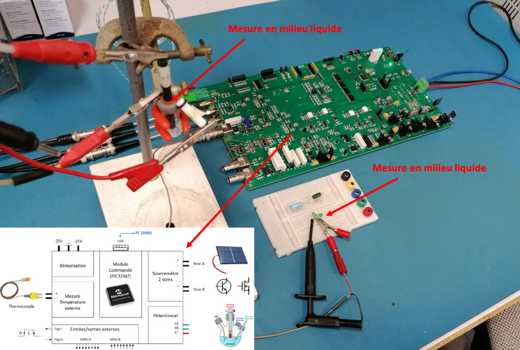 La mesure d’une propriété physique qu’elle soit dans le domaine de physique ou de la chimie se fonde quasiment exclusivement sur la mesure électrique d’un courant ou d’une tension. Cela nécessite de disposer d’instruments précis aussi bien en tension qu’en courant électrique avec de larges dynamiques de source et de mesure, tel que le sourcemètre. Le projet iMesure vise à développer un appareil de mesure multifonctionnelles permettant de réaliser des caractérisations électriques (tension/courant) en milieu liquide pour la caractérisation de solutions chimiques, et solide pour la caractérisation de composants électroniques.