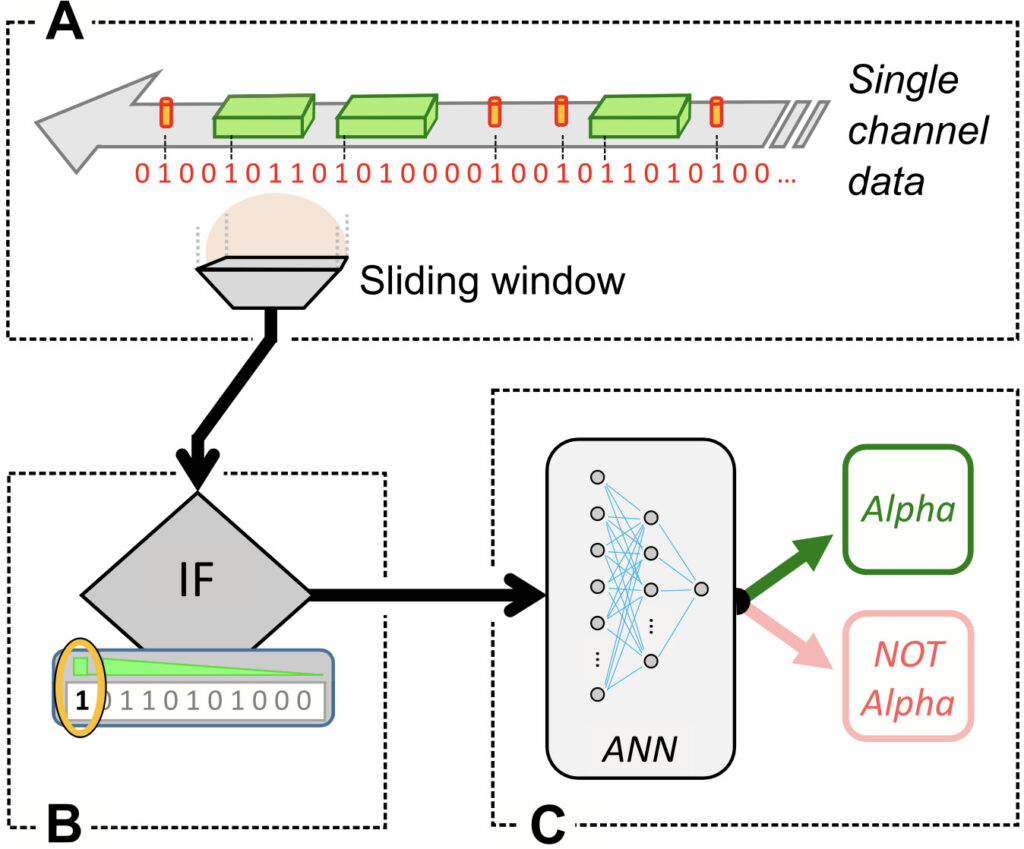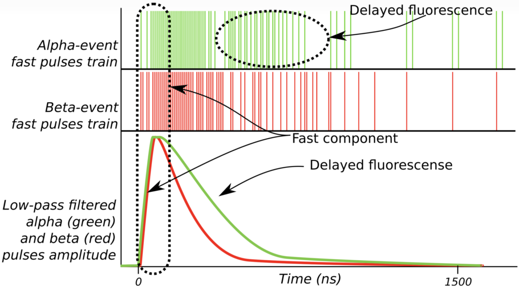 Alpha particles produce a higher delayed fluorescence component than beta particles. Rather than shaping or integrating pulses, the proposed method processes the raw fast pulse trains digitally and uses a trained ANN to detect the temporal signature of alpha interactions (trains of photons). This reframes alpha/beta discrimination as a time-series classification problem (see figure).