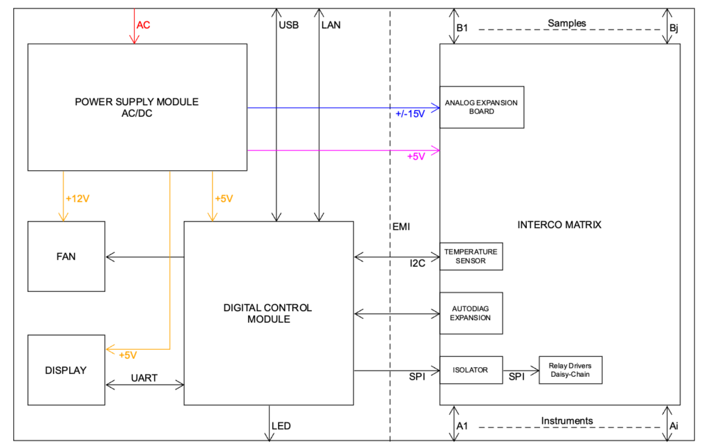 INTERCO est composé de plusieurs modules. Le module d’alimentation permet, à partir du secteur, de fournir la puissance et de réguler les niveaux de tension nécessaires au fonctionnement du système. Basé sur un microcontrôleur STM32, le module de contrôle permet de piloter le système et offre une interface de commande intuitive. La matrice d’interconnexion abrite des circuits à base de relais électromécanique permettant l’interconnexion bidirectionnelle des signaux des voies A et B. Les voies A sont destinées pour les instruments et les voies B pour les échantillons. Les voies A offrent la possibilité d’intégrer des cartes électroniques pour appliquer un traitement spécifique sur le signal (Ex. Filtre). En outre, la matrice d’interconnexion dispose de capteurs de température permettant d’éviter les gradients de température en régulant la température du système en utilisant un ventilateur. La partie analogique comportant la matrice d’interconnexion est isolée du reste du système par des plaques conductrices reliées à la terre.