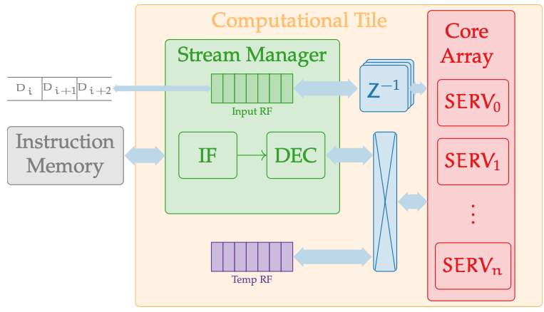 - Stream Manager (front-end): routes incoming streams, schedules work (FCFS), and centralizes instruction fetch/decode for all cores.