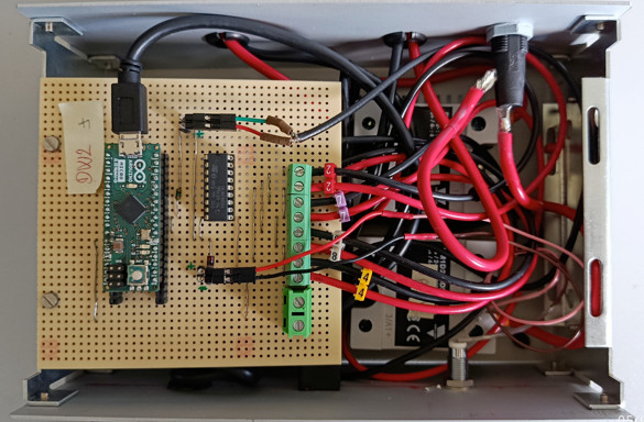 Un doctorant souhaite piloter un courant alternatif dans leur échantillon Indium Tin Oxyde (ITO) de valeur maximale 80V et 10A dans une resistance de 12 ohm 500W. Basiquement, il s’agit d’observer la formation du bulles lorsqu’un fluide entre en ébulition. La réalisation devant être bouclée très rapidement, nous avons choisi une plaque prototype et un contrôleur de type arduino micro et l’usage de 4 relais statiques rapides. Le montage est intégré à boitier de récupération.
