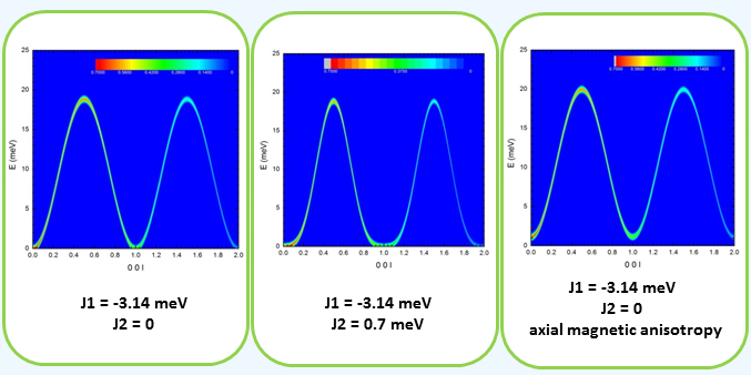 In the illustration below, J1 is ferromagnetic (<0), the value of J2 is varied, the magnetic anisotropy is defined as either axial or planar :