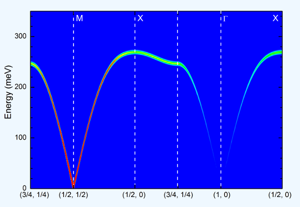 In the illustration below is represented the corresponding dispersion relation, along high symmetry directions of the 2D Brillouin zone, calculated with J1 = 111.8 meV and J2= -11.4 meV (according to R. Coldea et al., Phys. Rev. Letters 86, 5377 (2001)).